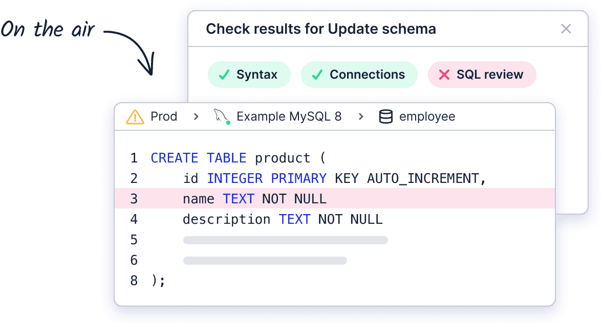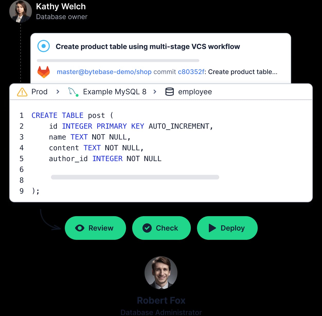 Learn moreBytebase streamlines database change deployment from non-prod to prod with review workflow, rollback, and optional GitOps integration.